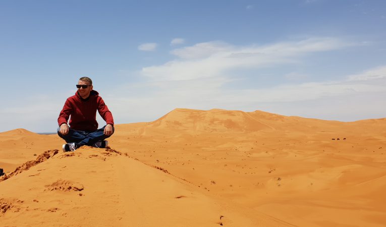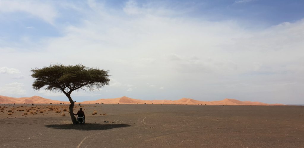 Ulazimo u Merzougu, grad na samome ulasku u pustinju, bez da vidimo prst pred nosom, jer prozor možeš otvoriti jedino ako želiš progutati šaku pijeska. Smještamo se u naš „hotel“, građevinu visine tri metra u potpunosti napravljenu od blata. Bez obzira na vrijeme vani, ostavljamo stvari u smještaju i odlazimo van do male pješčane dine svega nekoliko metara od našeg hotela. Moj prvi susret sa pustinjom ne traje dugo, jer na prvi udar groma i ponovni početak kiše bježimo u smještaj gdje provodimo ostatak vremena.